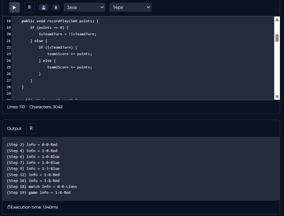 The next step I took was to create the recordPlay() method. I noticed that the method should do something differently whether the argument is 0 or if it is a positive integer. So, I first made an in statement to check if the argument was equal to zero. If it is, then I would change which team’s turn it is. Otherwise, I would add the points to the active team’s score. I did this by using another if statement to see which team’s turn it was, and then adding the points to the respectiv variable.